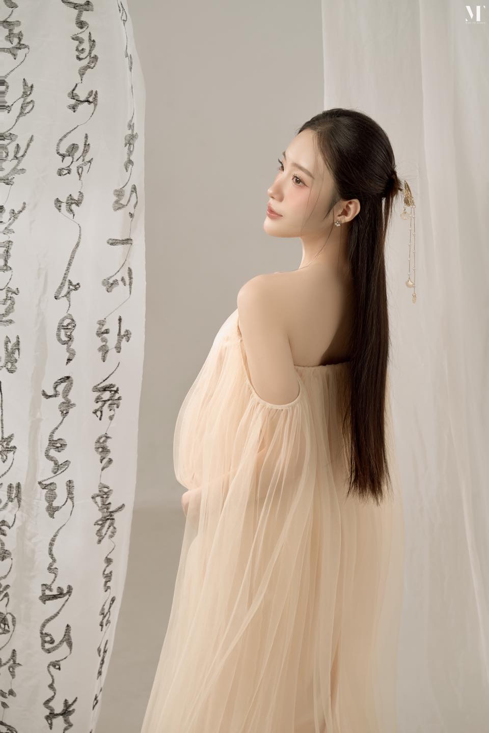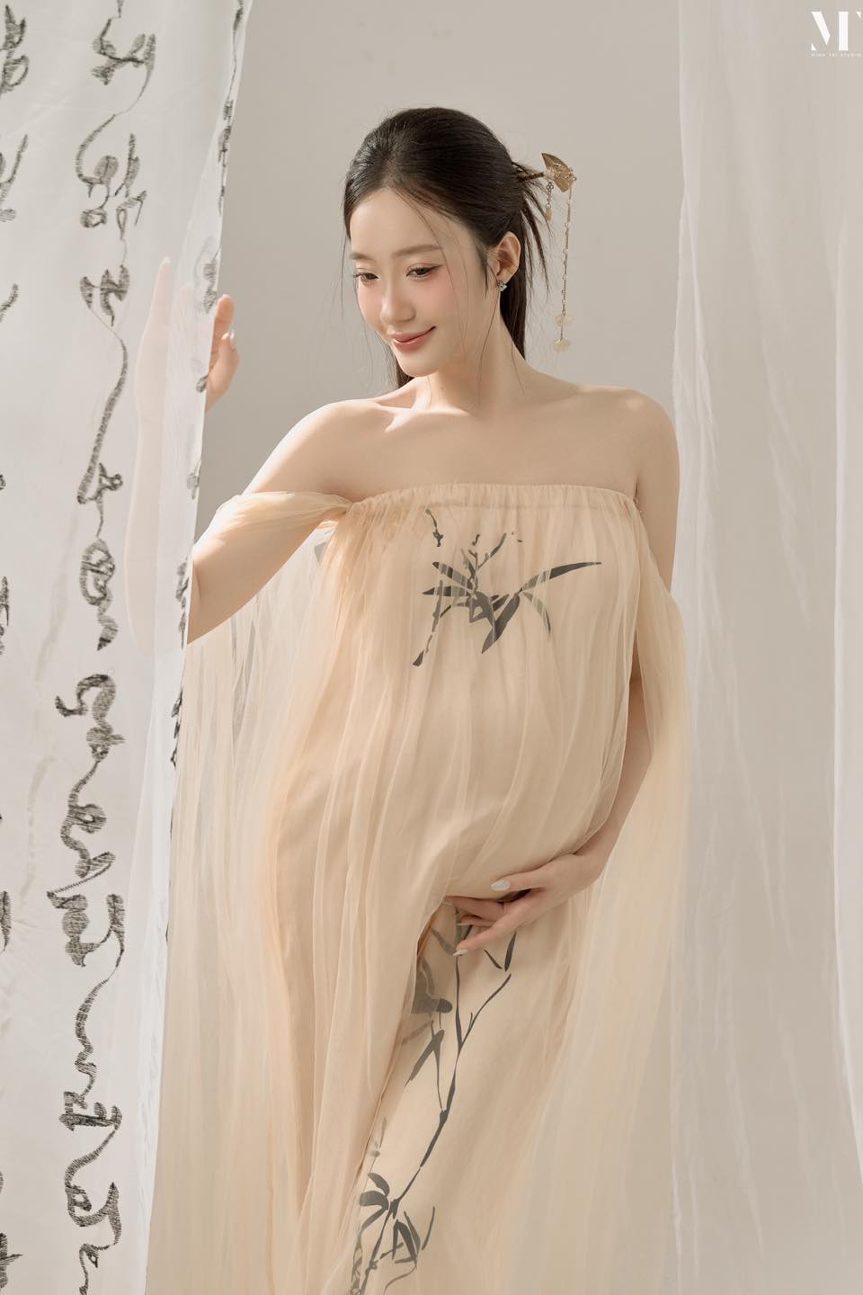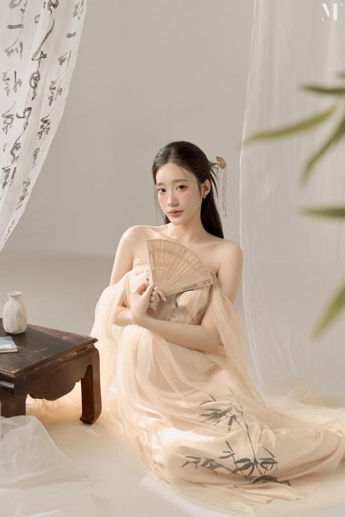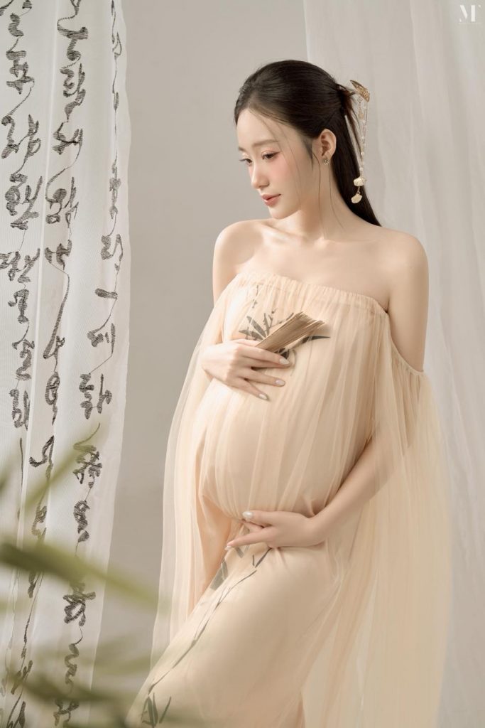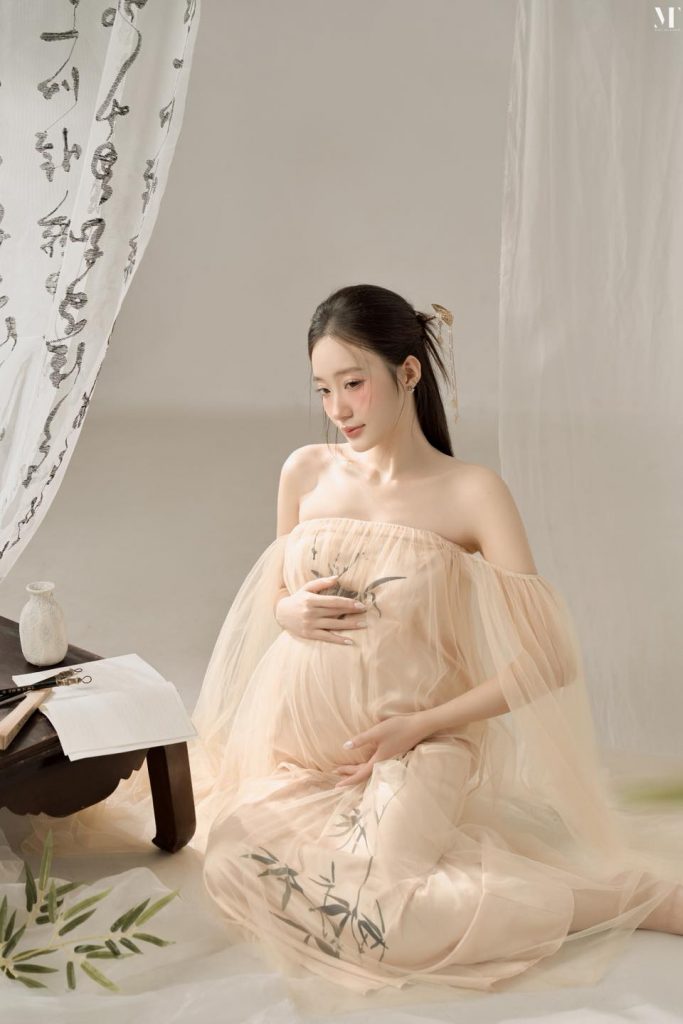 Không cần quá nhiều màu sắc, chỉ với ánh sáng nhẹ và tông nude tinh tế, concept Thanh Nguyệt khắc họa trọn vẻ đẹp dịu dàng, thanh khiết nhưng vẫn đầy khí chất của mẹ bầu 🌸