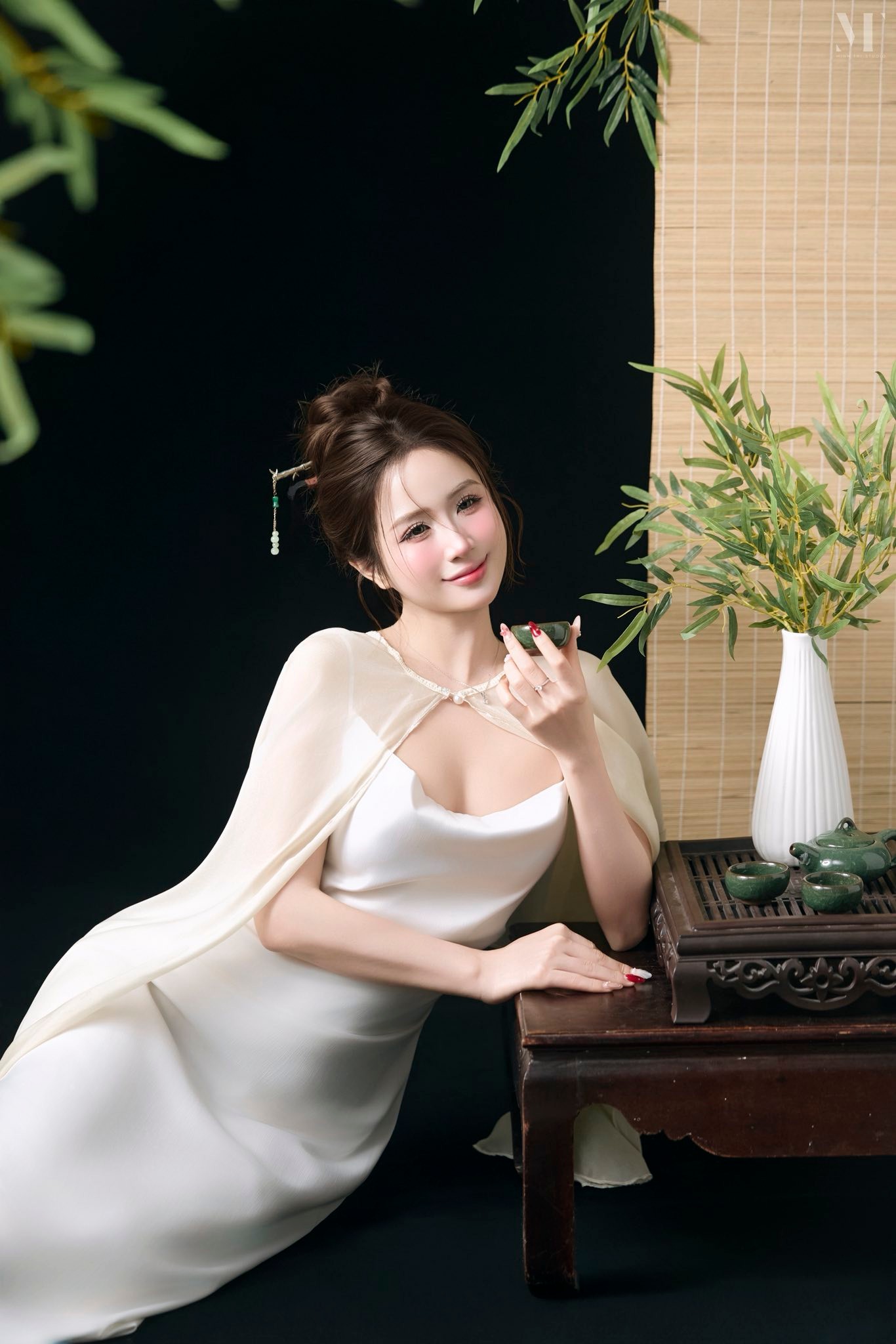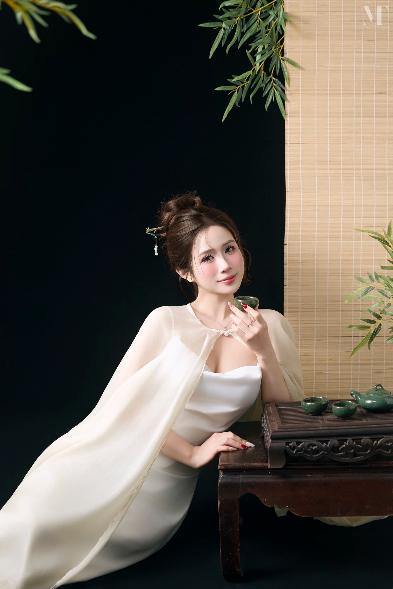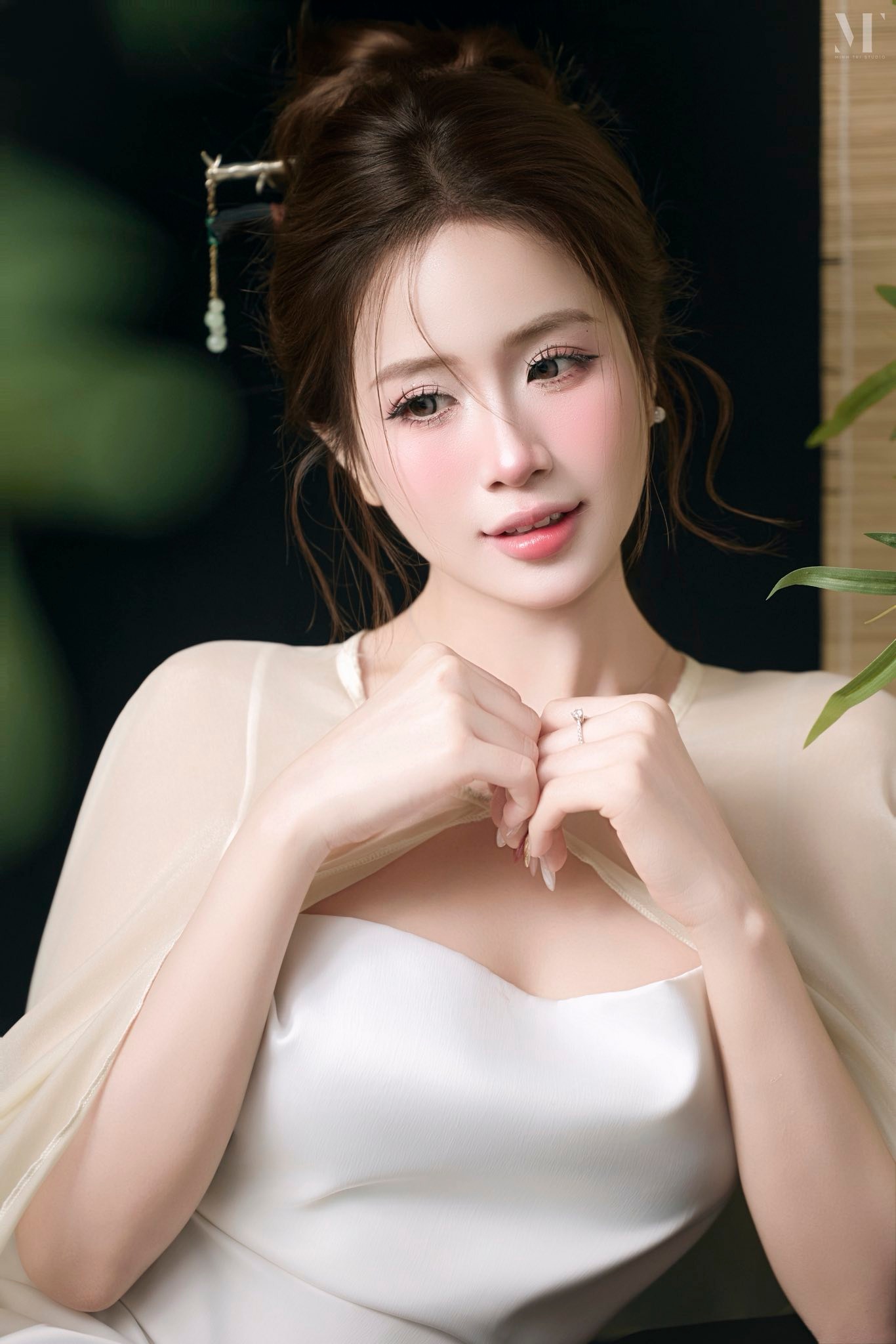 Layout makeup hồng sương nhẹ – gò mà ửng tự nhiên, mí mắt long lanh, làn da mịn như sáp. Tóc búi cao thanh tao, điểm thêm trâm ngọc tạo nét cổ điển nhưng vẫn hiện đại.