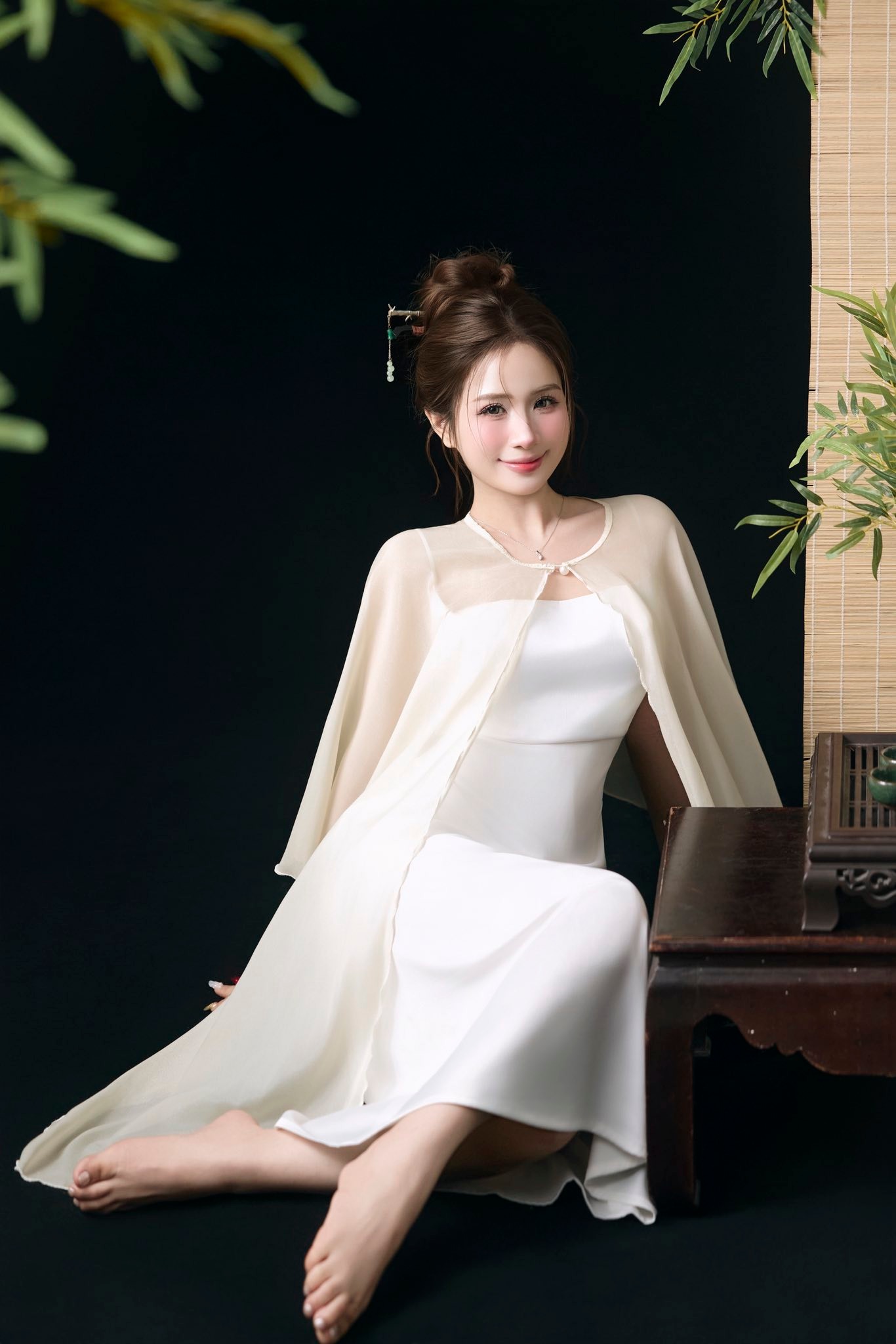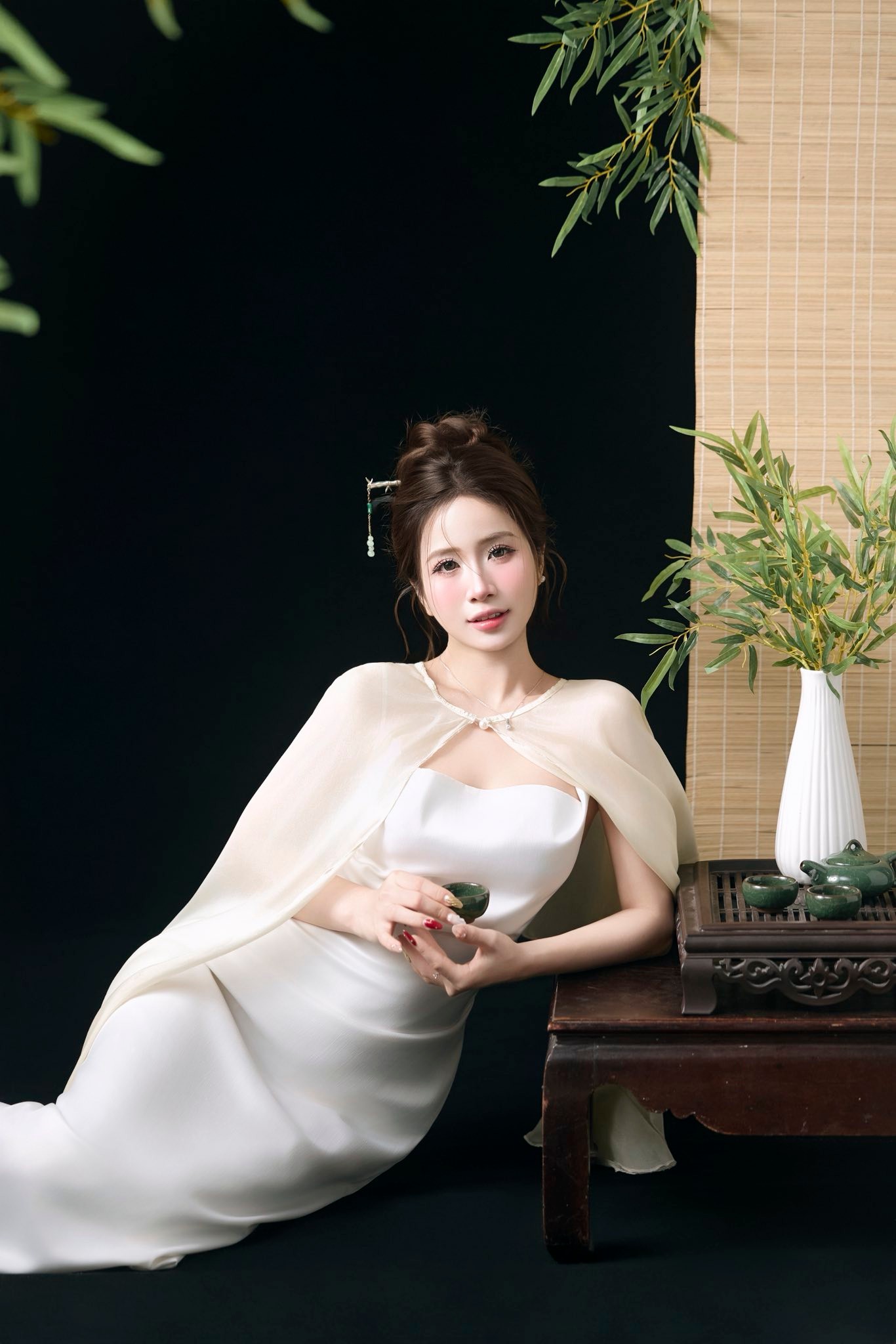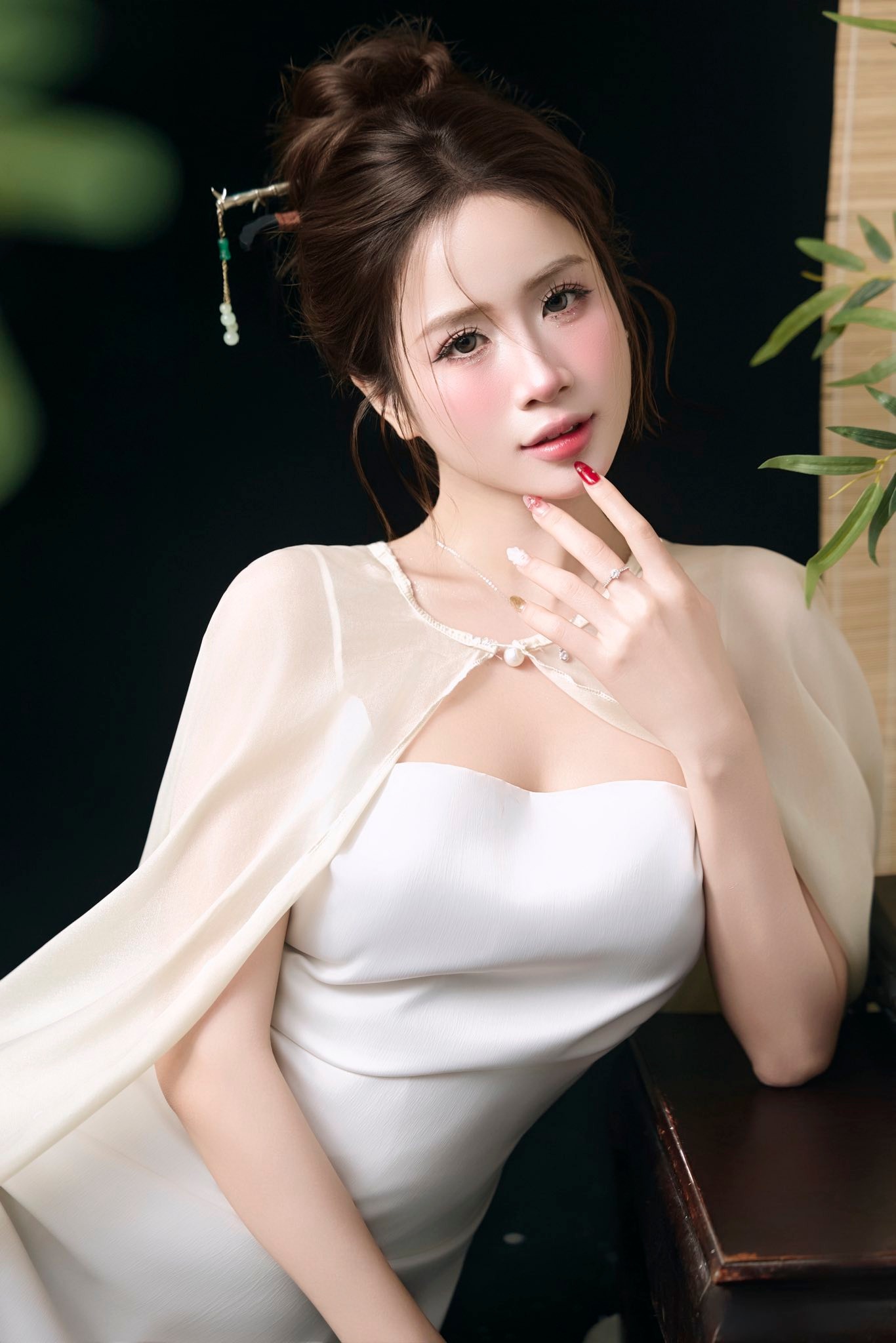 Layout makeup hồng sương nhẹ – gò mà ửng tự nhiên, mí mắt long lanh, làn da mịn như sáp. Tóc búi cao thanh tao, điểm thêm trâm ngọc tạo nét cổ điển nhưng vẫn hiện đại.