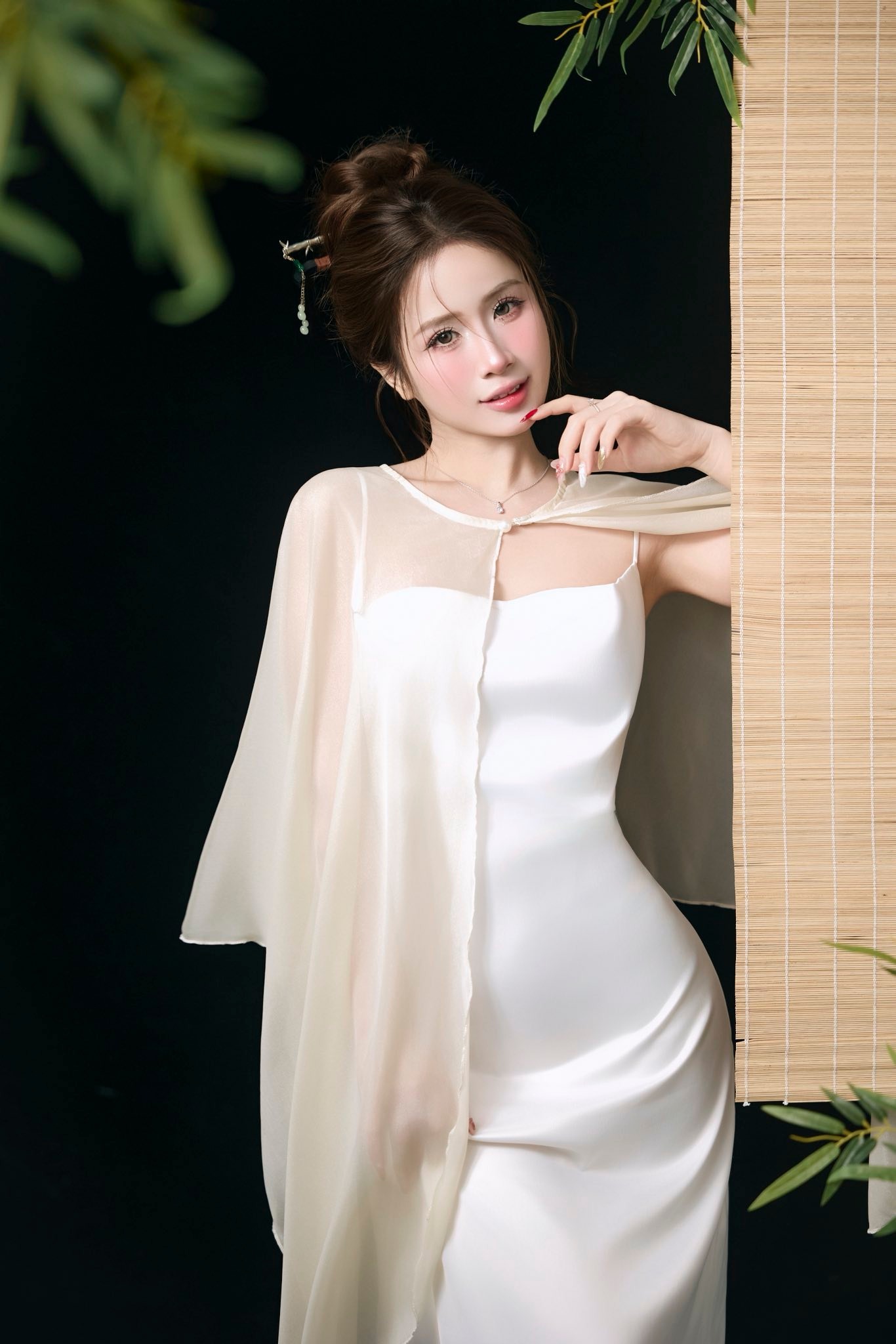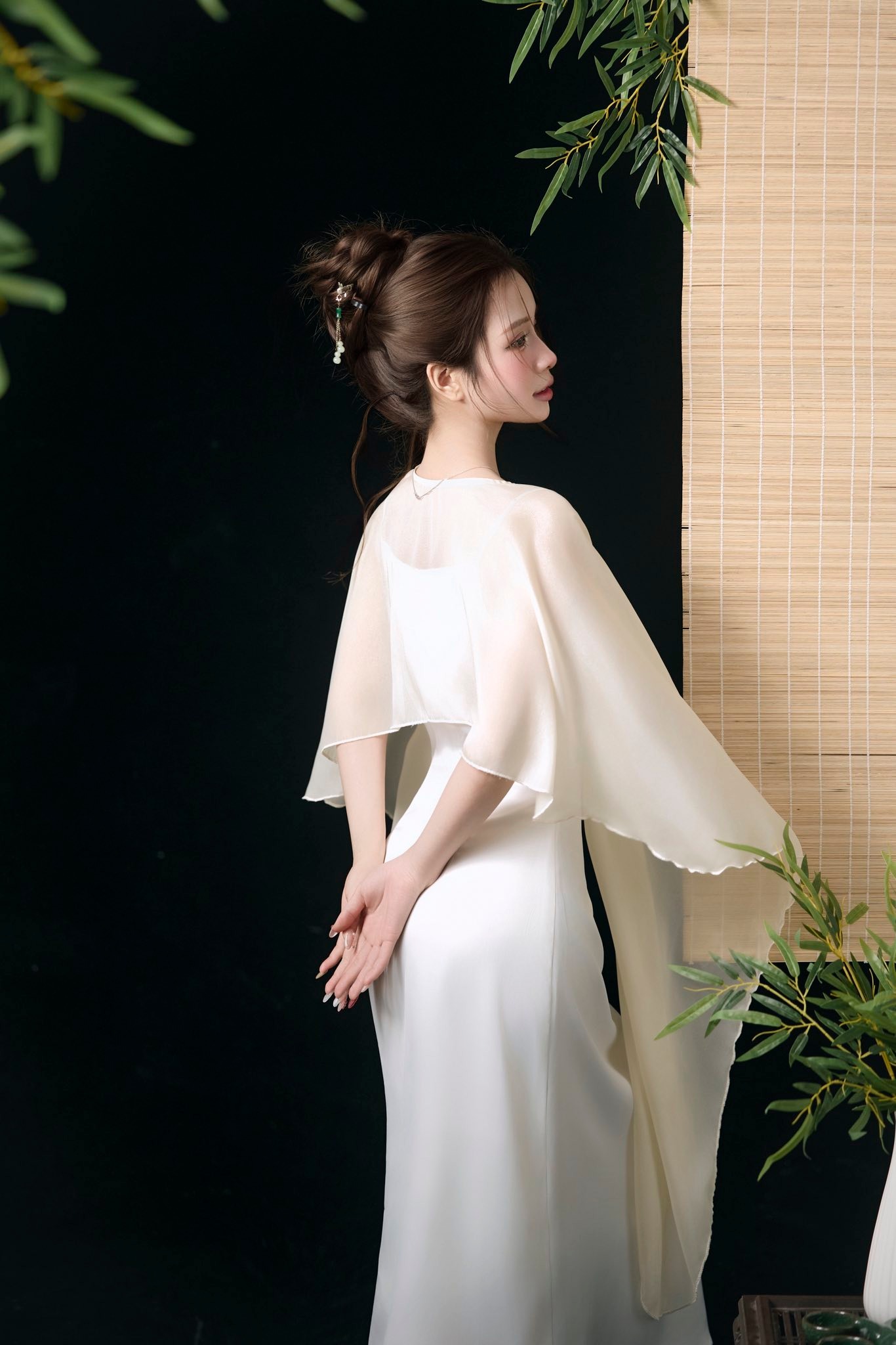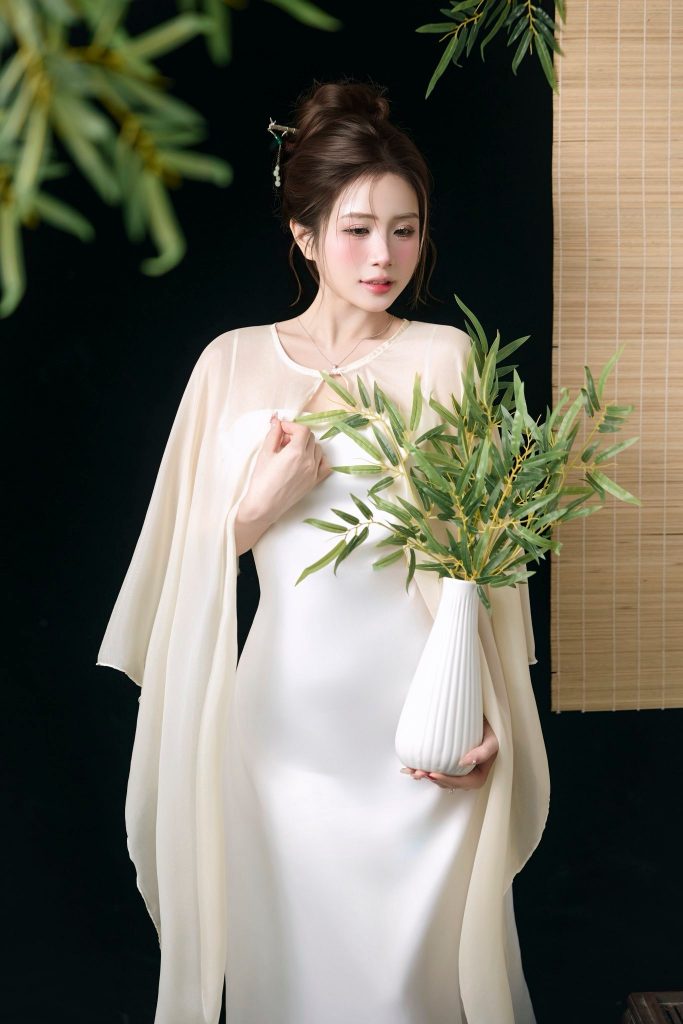 Chiếc váy lụa trắng dài ôm nhẹ, kết hợp cùng lớp cape mỏng bay mềm như sương sớm. Tổng thể mang lại cảm giác tinh khiết, thanh lịch và cực kỳ tôn dáng.