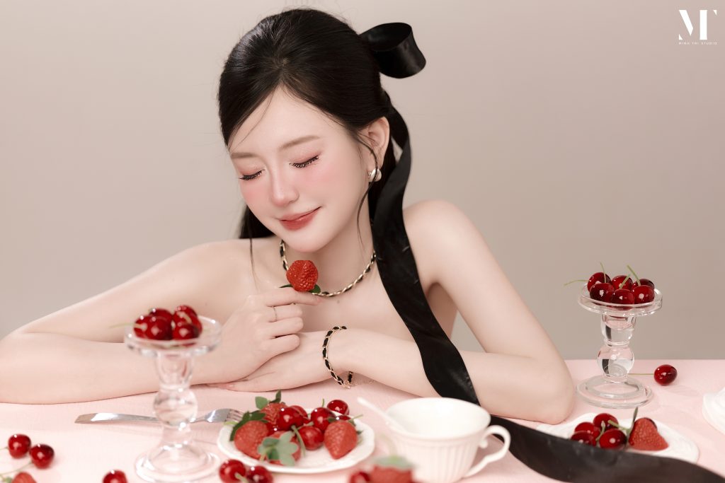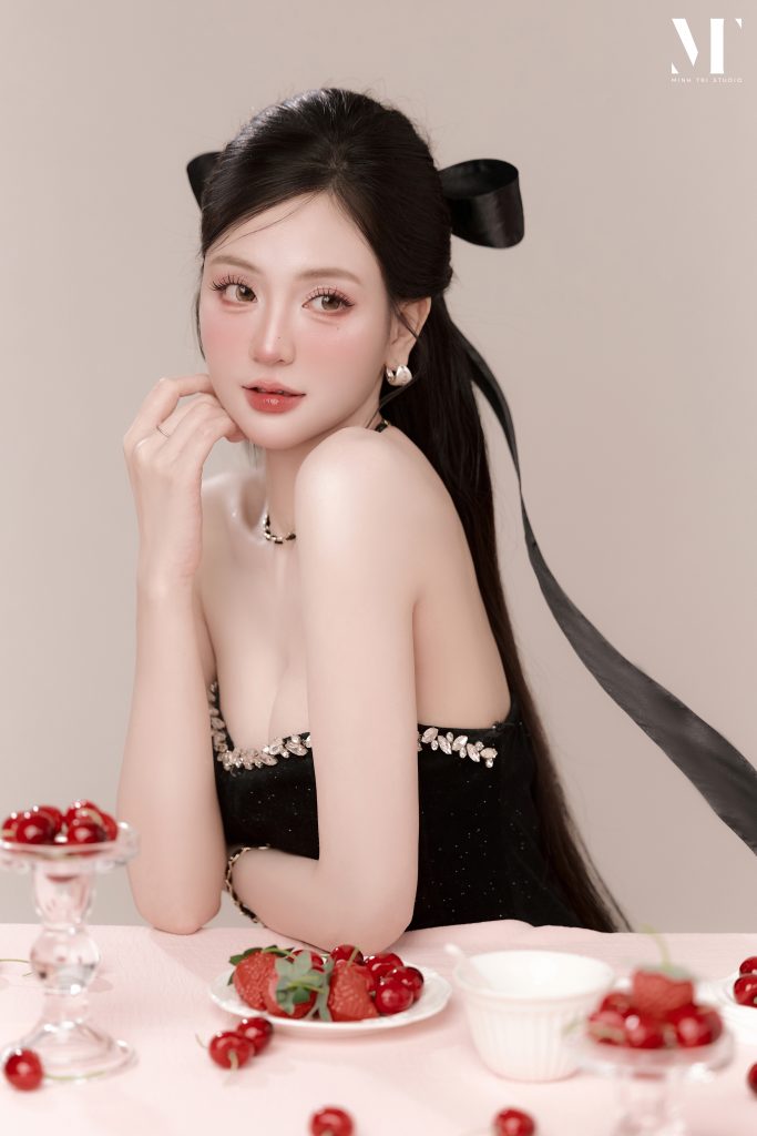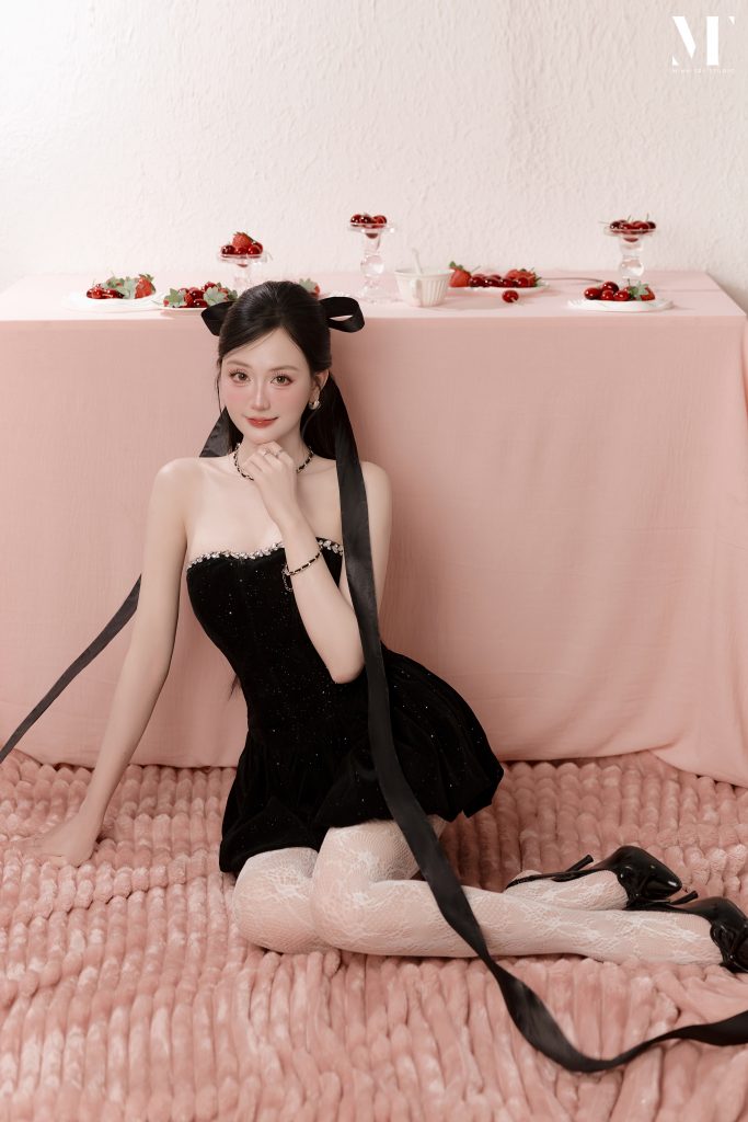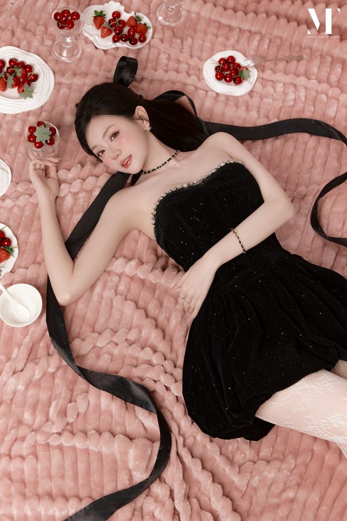 Vẻ đẹp tương phản của concept Velvet Birthday Điểm nhấn thị giác mạnh mẽ nhất của Velvet Birthday nằm ở việc sử dụng kỹ thuật chụp flatlay (chụp từ trên xuống). Khách hàng sẽ ngả mình trên một bề mặt thảm nhung màu hồng pastel, tạo cảm giác mềm mại, ngọt ngào. Trái ngược với nền hồng là trang phục váy quây ôm sát hoặc váy bồng bềnh mang sắc đen tuyền, giúp tôn bật đường cong và nước da trắng ngần. Sự kết hợp cùng các phụ kiện nhỏ tinh tế như đĩa dâu tây đỏ berry mọng nước, dải ruy băng lụa hay bánh kem tối giản tạo nên một khung hình vừa tươi vui, nữ tính lại vừa bí ẩn, quyến rũ.