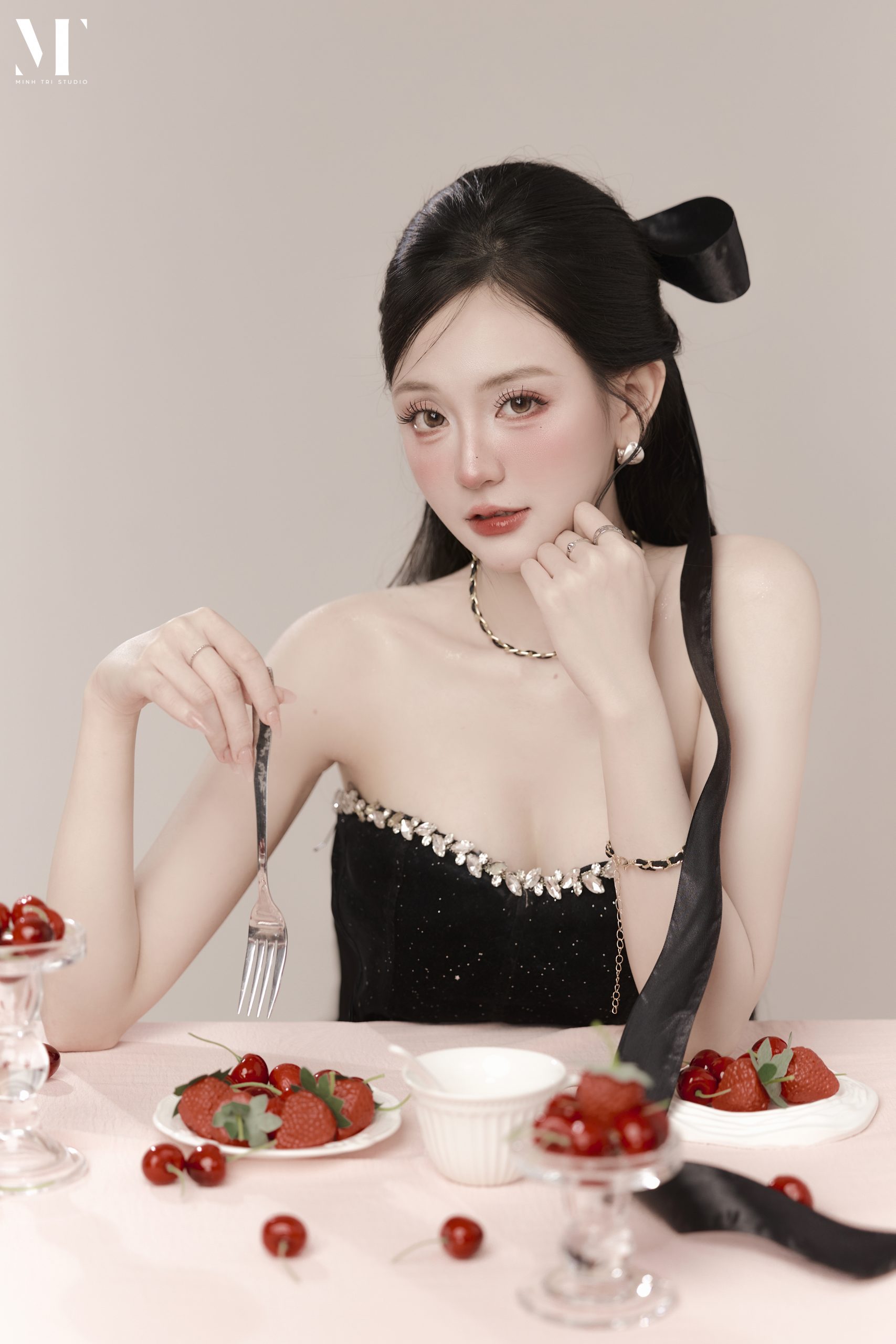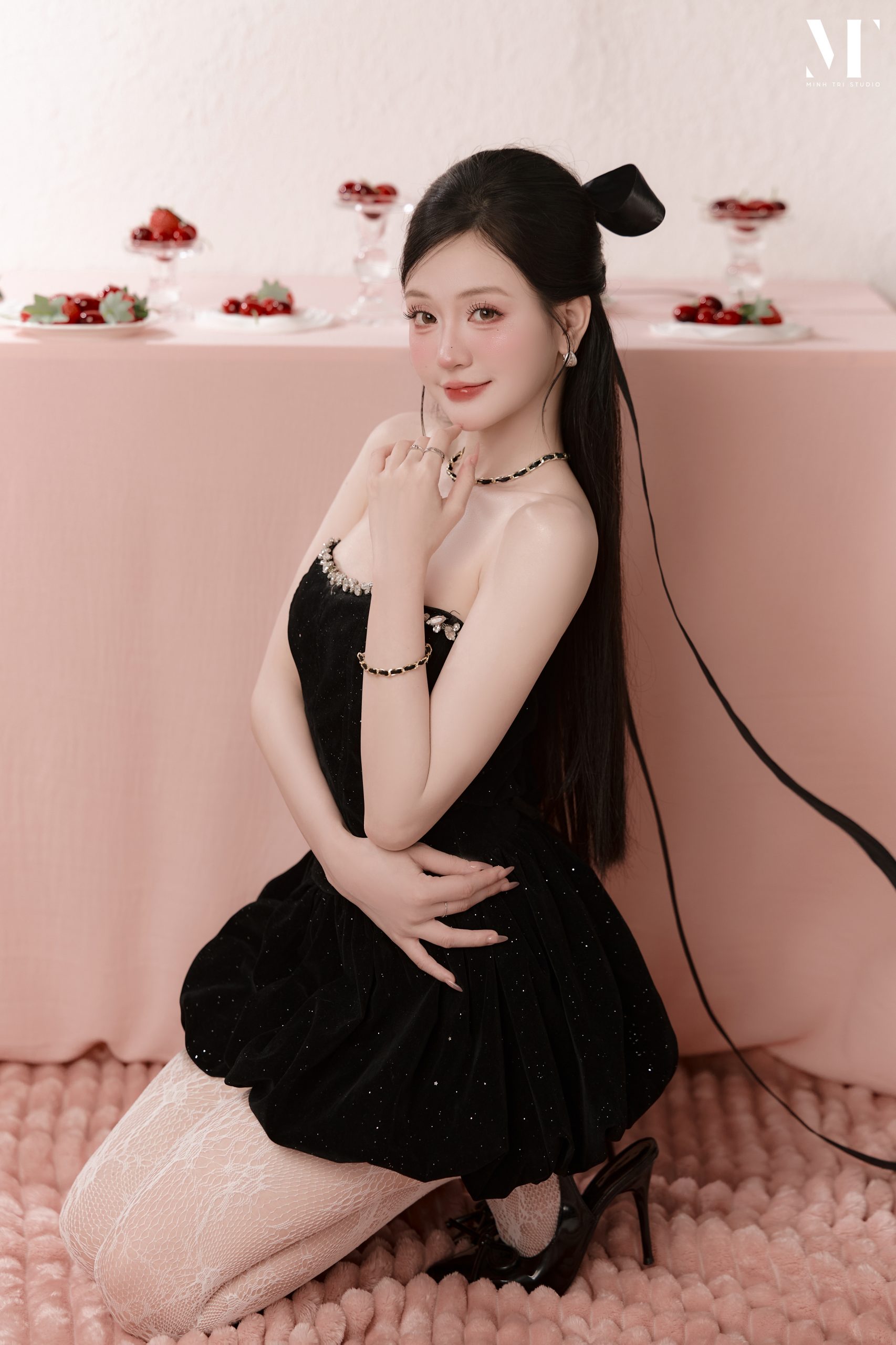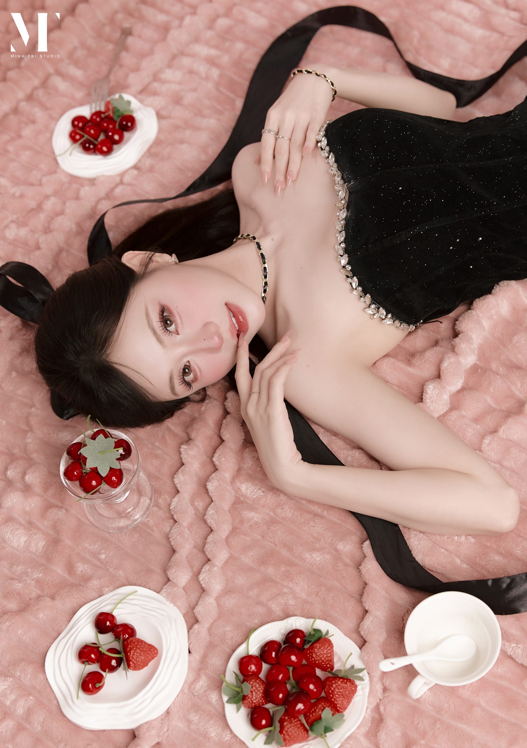 Vẻ đẹp tương phản của concept Velvet Birthday Điểm nhấn thị giác mạnh mẽ nhất của Velvet Birthday nằm ở việc sử dụng kỹ thuật chụp flatlay (chụp từ trên xuống). Khách hàng sẽ ngả mình trên một bề mặt thảm nhung màu hồng pastel, tạo cảm giác mềm mại, ngọt ngào. Trái ngược với nền hồng là trang phục váy quây ôm sát hoặc váy bồng bềnh mang sắc đen tuyền, giúp tôn bật đường cong và nước da trắng ngần. Sự kết hợp cùng các phụ kiện nhỏ tinh tế như đĩa dâu tây đỏ berry mọng nước, dải ruy băng lụa hay bánh kem tối giản tạo nên một khung hình vừa tươi vui, nữ tính lại vừa bí ẩn, quyến rũ.